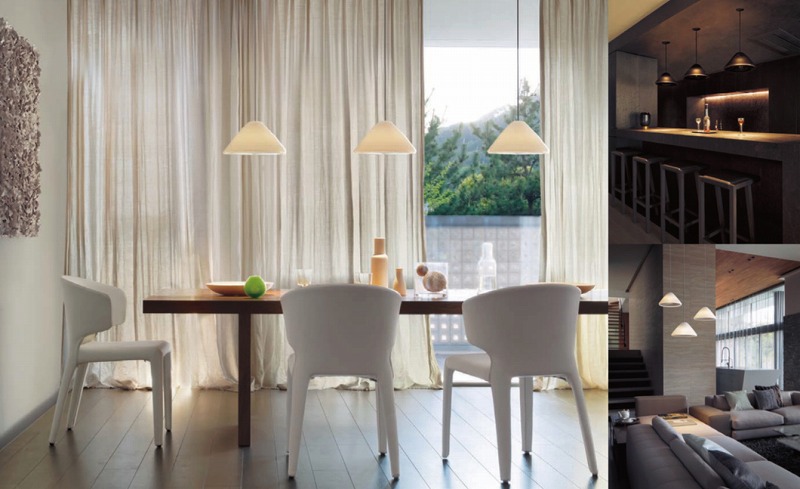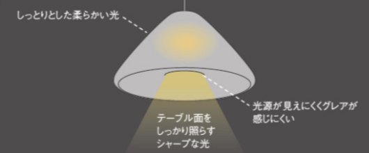 配光もしっかりと設計されており、直下はグレアを抑えたシャープな光でテーブル面を照らし、空間全体にはしっとりとした柔らかな光を広げる。