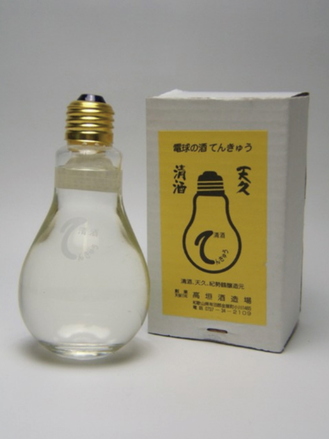 電球フォルムの瓶に詰められた和歌山は高垣酒造場の「天久(てんきゅう)」というお酒。