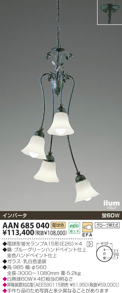 ÉÊ̾¡§¥¤¥ë¥à¥·¥ã¥ó¥Ç¥ê¥¢¡¡¾ö¿ô¡§¡¡¸÷¸»¸÷¿§¡§·Ö¸÷Åô¡ÊÅŵ忧¡Ë·Ö60W¡¡Åŵå·Á·Ö¸÷¥é¥ó¥×A15·Á(E26)¡ß4¡¡¹Ý¡¦¥Ö¥ë¡¼¥°¥ê¡¼¥ó¥Ï¥ó¥É¥Ú¥¤¥ó¥È»Å¾å¡¡¶â¿§¥Ï¥ó¥É¥Ú¥¤¥ó¥È»Å¾å¡¡¥¬¥é¥¹¡¦ÆýÇò¿§ÅÉÁõ¡¡¹â-985 Éý-¦Õ560 Á´Ä¹-3000¡Á1080mm ½Å-5.2kg¡É¡¡¾º¹ßÁõÃÖÂбþ·¿AEE590115ÊÌÇä