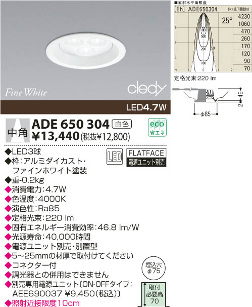 ÉÊ̾¡§LED¥À¥¦¥ó¥é¥¤¥È¡¡¾ö¿ô¡§¡¡¸÷¸»¸÷¿§¡§LED¡ÊÇò¿§¥¿¥¤¥×¡ËLED4.7W¡¡LED3µå¡Ê4.7W¡Ë¡¡¥¢¥ë¥ß¥À¥¤¥«¥¹¥È¡¦¥Õ¥¡¥¤¥ó¥Û¥ï¥¤¥ÈÅÉÁõ¡¡Éý-¦Õ85 ½ÐÉý-2 Ëä¹þ·ê·Â-¦Õ75 Ëä¹þ¹â-46 ¼èÉÕɬÍ×¹â-70mm ½Å-0.2kg¡É¡¡¹â±é¿§¥¿¥¤¥×¡¦Ra90°Ê¾å¡¡ÅŸ»¥æ¥Ë¥Ã¥ÈÊÌÃÖ·¿¡¡ÀìÍÑÅŸ»¥æ¥Ë¥Ã¥ÈAEE690037ÊÌÇä