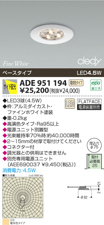 ÉÊ̾¡§LED¥À¥¦¥ó¥é¥¤¥È¡¡¾ö¿ô¡§¡¡¸÷¸»¸÷¿§¡§LED¡ÊÅŵ忧¥¿¥¤¥×¡ËLED4.5W¡¡LED3µå¡Ê4.5W¡Ë¡¡¥¢¥ë¥ß¥À¥¤¥«¥¹¥È¡¦¥Õ¥¡¥¤¥ó¥Û¥ï¥¤¥ÈÅÉÁõ¡¡Éý-¦Õ82 ½ÐÉý-2 Ëä¹þ·ê·Â-¦Õ75 Ëä¹þ¿¼-21 ¼èÉÕɬÍ×¹â-25mm ½Å-0.2kg¡É¡¡¹â±é¿§¥¿¥¤¥×¡¦Ra95°Ê¾å¡¡ÅŸ»¥æ¥Ë¥Ã¥ÈÊÌÃÖ·¿¡¡ÀìÍÑÅŸ»¥æ¥Ë¥Ã¥ÈAEE690037ÊÌÇä