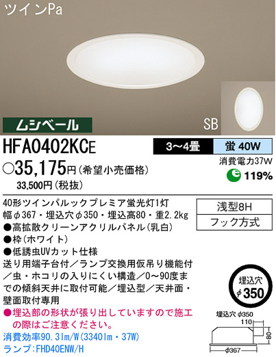 ¡üËä¹þÉô¤Î·Á¾õ¤¬Ä¥¤ê½Ð¤·¤Æ¤¤¤Þ¤¹¤Î¤Ç»Ü¹©¤ÎºÝ¤Ï¤´Ãí°Õ¤¯¤À¤µ¤¤¡£ ¾ÃÈñ¸úΨ90.3lm/W(3340lm¡¦37W) ¥é¥ó¥×:FHD40ENW¡¿H ¥Ä¥¤¥óPa SB