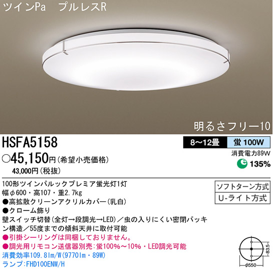 ¡üÄ´¸÷ÍÑ¥ê¥â¥³¥óÁ÷¿®´ïÊÌÇä¡§·Ö100¡ó¡Á10¡ó¡¦LEDÄ´¸÷²Äǽ ¾ÃÈñ¸úΨ109.8lm/W(9770lm¡¦89W) ¥é¥ó¥×:FHD100ENW¡¿H ¥Ä¥¤¥óPa¡¡¥×¥ë¥ì¥¹R ÌÀ¤ë¤µ¥Õ¥ê¡¼10