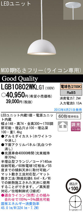 Panasonic LED ¥Ú¥ó¥À¥ó¥È LGB10802WKLG1