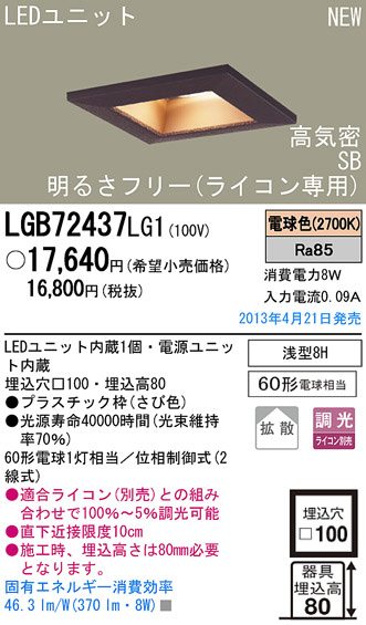 Panasonic LED ¥À¥¦¥ó¥é¥¤¥È ÏÂÉ÷¾ÈÌÀ LGB72437LG1