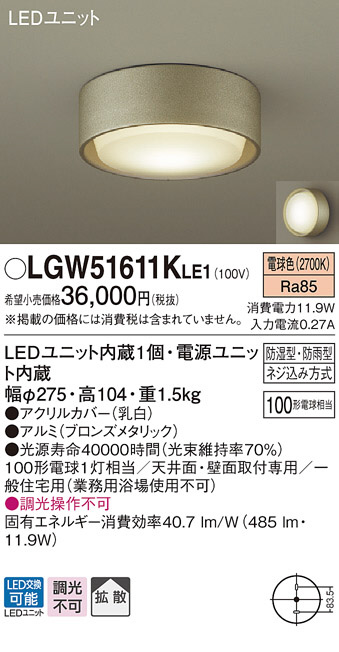 Panasonic LED ¥¨¥¯¥¹¥Æ¥ê¥¢¡¦¥¢¥¦¥È¥É¥¢ LGW51611KLE1