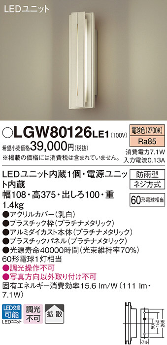 Panasonic LED ¥¨¥¯¥¹¥Æ¥ê¥¢¡¦¥¢¥¦¥È¥É¥¢ LGW80126LE1