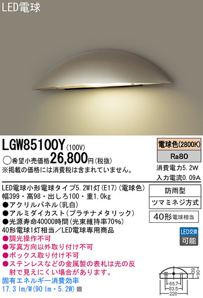 Panasonic LED ¥¨¥¯¥¹¥Æ¥ê¥¢¡¦¥¢¥¦¥È¥É¥¢ LGW85100Y