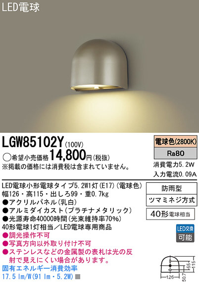 Panasonic LED ¥¨¥¯¥¹¥Æ¥ê¥¢¡¦¥¢¥¦¥È¥É¥¢ LGW85102Y
