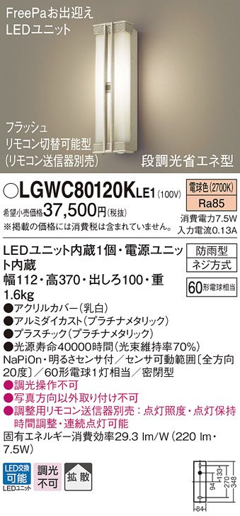 Panasonic LED ¥¨¥¯¥¹¥Æ¥ê¥¢¡¦¥¢¥¦¥È¥É¥¢ LGWC80120KLE1