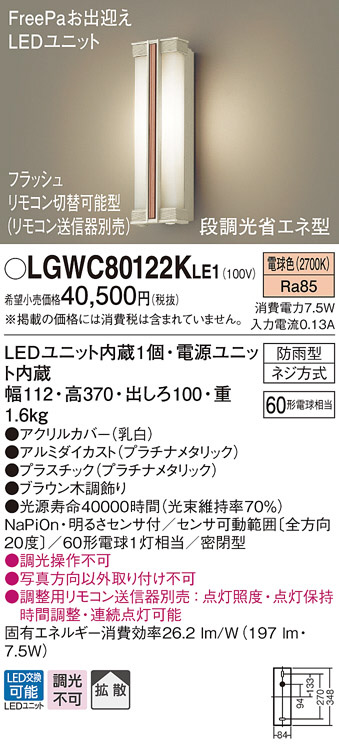 Panasonic LED ¥¨¥¯¥¹¥Æ¥ê¥¢¡¦¥¢¥¦¥È¥É¥¢ LGWC80122KLE1