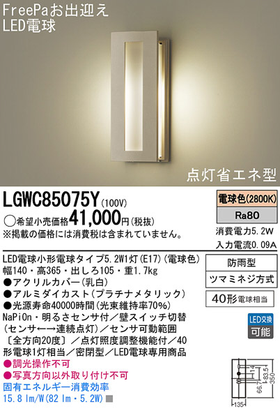 Panasonic LED ¥¨¥¯¥¹¥Æ¥ê¥¢¡¦¥¢¥¦¥È¥É¥¢ LGWC85075Y