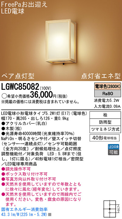 Panasonic LED ¥¨¥¯¥¹¥Æ¥ê¥¢¡¦¥¢¥¦¥È¥É¥¢ LGWC85082