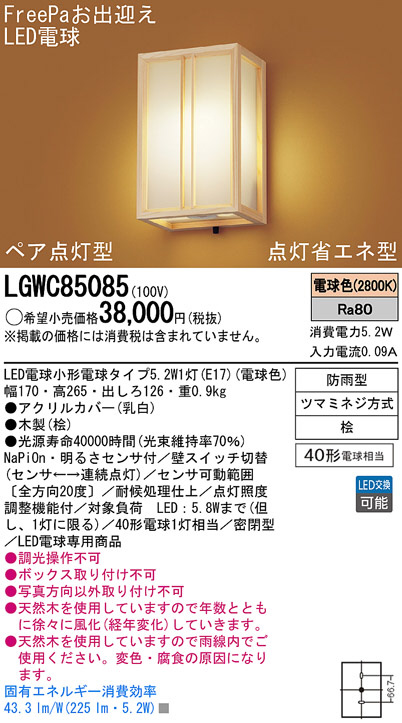 Panasonic LED ¥¨¥¯¥¹¥Æ¥ê¥¢¡¦¥¢¥¦¥È¥É¥¢ LGWC85085