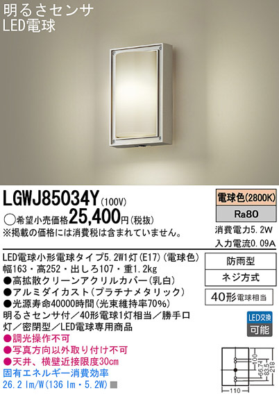 Panasonic LED ¥¨¥¯¥¹¥Æ¥ê¥¢¡¦¥¢¥¦¥È¥É¥¢ LGWJ85034Y