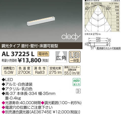 ¥³¥¤¥º¥ß¾ÈÌÀ KOIZUMI LED´ÖÀÜÍÑÅô¶ñ AL37225L