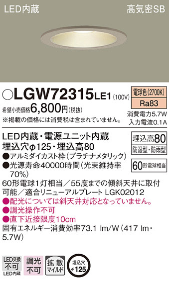 Panasonic LED ¥À¥¦¥ó¥é¥¤¥È LGW72315LE1