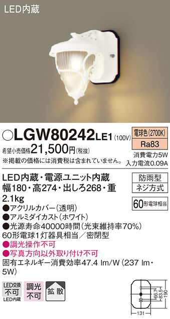 Panasonic LED ¥¨¥¯¥¹¥Æ¥ê¥¢¡¦¥¢¥¦¥È¥É¥¢ LGW80242LE1