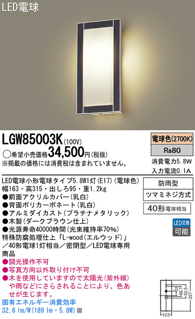 Panasonic LED ¥¨¥¯¥¹¥Æ¥ê¥¢¡¦¥¢¥¦¥È¥É¥¢ LGW85003K