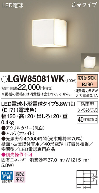 Panasonic LED ¥¨¥¯¥¹¥Æ¥ê¥¢¡¦¥¢¥¦¥È¥É¥¢ LGW85081WK