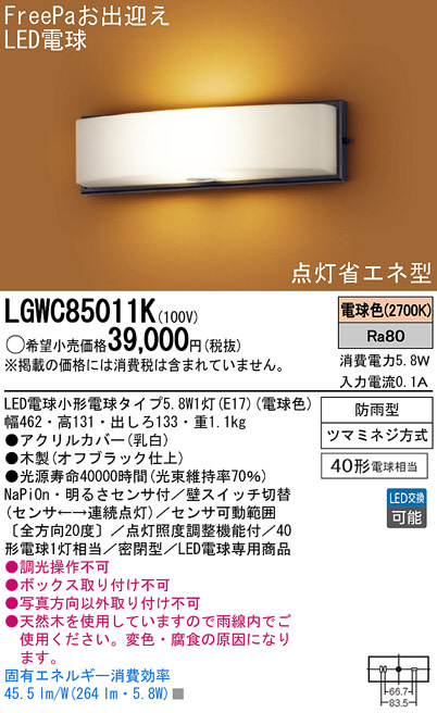 Panasonic LED ¥¨¥¯¥¹¥Æ¥ê¥¢¡¦¥¢¥¦¥È¥É¥¢ LGWC85011K