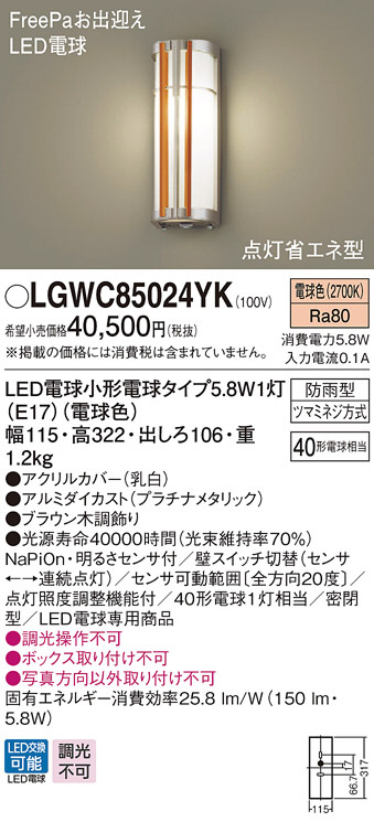 Panasonic LED ¥¨¥¯¥¹¥Æ¥ê¥¢¡¦¥¢¥¦¥È¥É¥¢ LGWC85024YK
