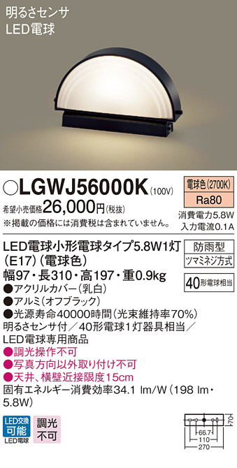 Panasonic LED ¥¨¥¯¥¹¥Æ¥ê¥¢¡¦¥¢¥¦¥È¥É¥¢ LGWJ56000K