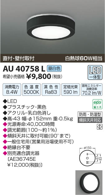¥³¥¤¥º¥ß¾ÈÌÀ KOIZUMI Ëɱ«Ëɼ¾·¿¥·¡¼¥ê¥ó¥° LED AU40758L