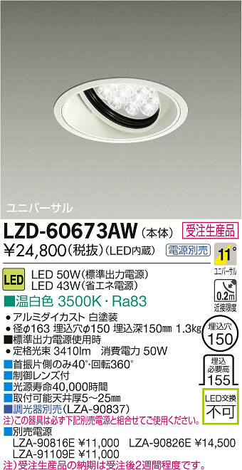 ¢£¼ó¿¶ÊÒ¦¤Î¤ß40¡ë¡¦²óž360¡ë|¢£À©¸æ¥ì¥ó¥ºÉÕ|¢£¸÷¸»¼÷Ì¿40¡¤000»þ´Ö|¢£¼èÉÕ²Äǽŷ°æ¸ü5¡Á25mm|¢£Ä´¸÷´ïÊÌÇä¡ÊLZA-90837¡Ë|Ãí¡Ë¤³¤Î´ï¶ñ¤Ïɬ¤º²¼µÊÌÇäÅŸ»¤ÈÁȹ礻¤Æ¤´»ÈÍѤ¯¤À¤µ¤¤¡£|¢£ÊÌÇäÅŸ»¡¡LZA-90816E ¡ï11¡¤000 LZA-90826E ¡ï14¡¤500 LZA-91109E ¡ï11¡¤000|Ãí¡Ë¼õÃíÀ¸»ºÉʤÎǼ´ü¤Ï¼õÃí¸å2½µ´ÖÄøÅ٤Ǥ¹¡£|¢£É¸½à½ÐÎÏÅŸ»»ÈÍÑ»þ¡¡Äê³Ê¸÷« 3410lm¡¡¾ÃÈñÅÅÎÏ 50W|Ra83