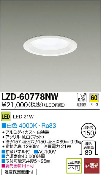 DAIKO Âç¸÷Åŵ¡ LED¥À¥¦¥ó¥é¥¤¥È LZD-60778NW