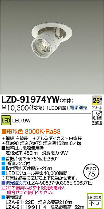 ¢£¼ó¿¶ÊÒ¦¤Î¤ß75¡ë¡¦²óž360¡ë|¢£À©¸æ¥ì¥ó¥ºÉÕ|¢£¼èÉÕ²Äǽŷ°æ¸ü5¡Á25mm|¢£LED¥â¥¸¥å¡¼¥ë¼÷Ì¿40¡¤000»þ´Ö|¢¨Åô¶ñ¤ÏɬÍפ˱þ¤¸¤Æ¾å²¼¤Ëư¤«¤»¤Þ¤¹¡£|¢£Ä´¸÷´ïÊÌÇä¡ÊLZA-90837¡¦90306E¡¦90637E¡Ë|Ãí¡Ë¤³¤Î´ï¶ñ¤Ïɬ¤º²¼µÊÌÇäÅŸ»¤ÈÁȹ礻¤Æ¤´»ÈÍѤ¯¤À¤µ¤¤¡£|¢£ÊÌÇäÅŸ»¡¡LZA-91122E¡¡Ëä¹þɬÍ×¹â210mm¡¡LZA-91119¡¦91114¡¡Ëä¹þɬÍ×¹â152mm|¢£É¸½à½ÐÎÏÅŸ»»ÈÍÑ»þ¡¡Äê³Ê¸÷« 480lm¡¡¾ÃÈñÅÅÎÏ 9W|Ra83