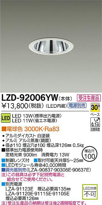 ¢£À©¸æ¥ì¥ó¥ºÉÕ|¢£¼èÉÕ²Äǽŷ°æ¸ü5¡Á25mm|¢£LED¥â¥¸¥å¡¼¥ë¼÷Ì¿40¡¤000»þ´Ö|¢£Ä´¸÷´ïÊÌÇä¡ÊLZA-90837¡¦90306E¡¦90637E¡Ë|Ãí¡Ë¤³¤Î´ï¶ñ¤Ïɬ¤º²¼µÊÌÇäÅŸ»¤ÈÁȹ礻¤Æ¤´»ÈÍѤ¯¤À¤µ¤¤¡£|¢£ÊÌÇäÅŸ»¡¡LZA-91123E¡¡Ëä¹þɬÍ×¹â135mm¡¡LZA-91120E¡¦91115E¡¦91105E¡¡Ëä¹þɬÍ×¹â126mm|Ãí¡Ë¼õÃíÀ¸»ºÉʤÎǼ´ü¤Ï¼õÃí¸å2½µ´ÖÄøÅ٤Ǥ¹¡£|¢£É¸½à½ÐÎÏÅŸ»»ÈÍÑ»þ¡¡Äê³Ê¸÷« 900lm¡¡¾ÃÈñÅÅÎÏ 13W|Ra83