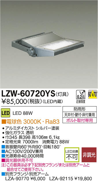¢£¼ó¿¶Êɸþ60¡ë³°¸þ90¡ë¡¦²óž180¡ë|¢£AC100V/200V·óÍÑ|¢£¸÷¸»¼÷Ì¿40¡¤000»þ´Ö|¢£Ä´¸÷´ïÊ»ÍÑÉÔ²Ä|Ãí¡Ë¤³¤Î´ï¶ñ¤Ïɬ¤º²¼µÊÌÇä¥Õ¥é¥ó¥¸¤Þ¤¿¤ÏÊÌÇ䥢¡¼¥à¤ÈÁȹ礻¤Æ¤´»ÈÍѲ¼¤µ¤¤¡£|¢£ÊÌÇä¥Õ¥é¥ó¥¸¡¦ÊÌÇ䥢¡¼¥àLZA-90770 ¡ï6¡¤000 LZA-92115 ¡ï19¡¤800|Äê³Ê¸÷« 7000lm¡¡¾ÃÈñÅÅÎÏ 88W|Ra83