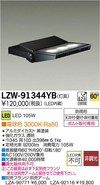 ¢£¼ó¿¶Êɸþ60¡ë³°¸þ90¡ë¡¦²óž180¡ë|¢£AC100V/200V·óÍÑ|¢£¸÷¸»¼÷Ì¿40¡¤000»þ´Ö|¢£Ä´¸÷´ïÊ»ÍÑÉÔ²Ä|Ãí¡Ë¤³¤Î´ï¶ñ¤Ïɬ¤º²¼µÊÌÇä¥Õ¥é¥ó¥¸¤Þ¤¿¤ÏÊÌÇ䥢¡¼¥à¤ÈÁȹ礻¤Æ¤´»ÈÍѲ¼¤µ¤¤¡£|¢£ÊÌÇä¥Õ¥é¥ó¥¸¡¦ÊÌÇ䥢¡¼¥àLZA-90771 ¡ï6¡¤000 LZA-92116 ¡ï19¡¤800|Äê³Ê¸÷« 9200lm¡¡¾ÃÈñÅÅÎÏ 105W|Ra80