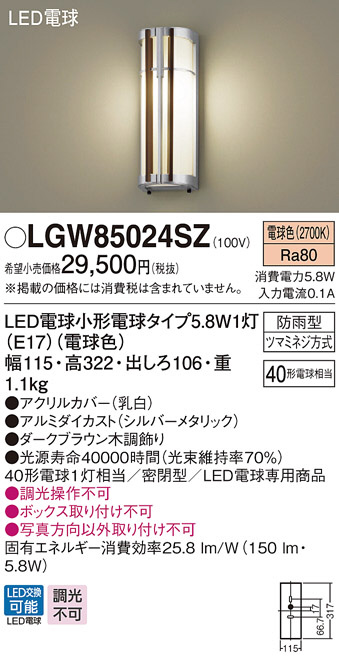 Panasonic LED ¥¨¥¯¥¹¥Æ¥ê¥¢¡¦¥¢¥¦¥È¥É¥¢ LGW85024SZ