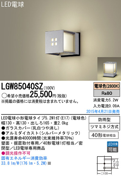 Panasonic LED ¥¨¥¯¥¹¥Æ¥ê¥¢¡¦¥¢¥¦¥È¥É¥¢ LGW85040SZ