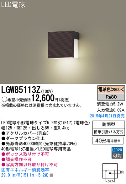 Panasonic LED ¥¨¥¯¥¹¥Æ¥ê¥¢¡¦¥¢¥¦¥È¥É¥¢ LGW85113Z
