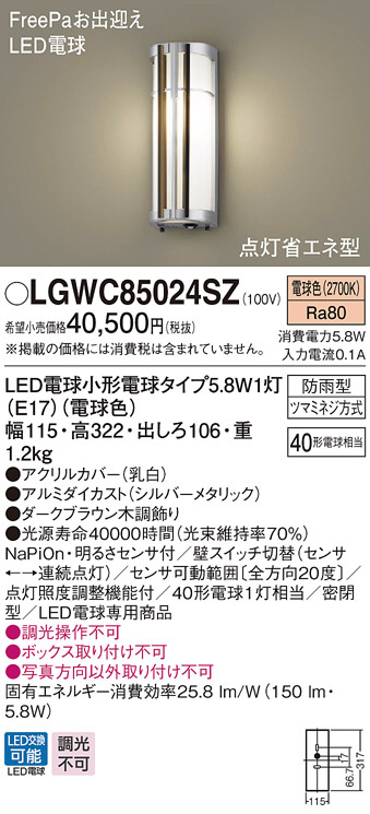 Panasonic LED ¥¨¥¯¥¹¥Æ¥ê¥¢¡¦¥¢¥¦¥È¥É¥¢ LGWC85024SZ