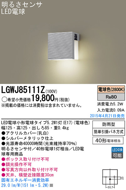 Panasonic LED ¥¨¥¯¥¹¥Æ¥ê¥¢¡¦¥¢¥¦¥È¥É¥¢ LGWJ85111Z
