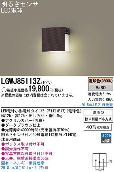 Panasonic LED ¥¨¥¯¥¹¥Æ¥ê¥¢¡¦¥¢¥¦¥È¥É¥¢ LGWJ85113Z