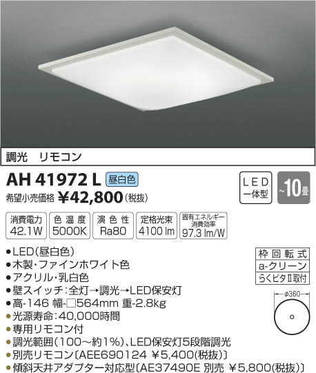 LED42.1W|¡üLED¡ÊÃëÇò¿§¡Ë|¡üÌÚÀ½¡¦¥Õ¥¡¥¤¥ó¥Û¥ï¥¤¥È¿§|¡ü¥¢¥¯¥ê¥ë¡¦ÆýÇò¿§|¡üÊÉ¥¹¥¤¥Ã¥Á¡§Á´Åô¢ªÄ´¸÷¢ªLEDÊݰÂÅô|¡É¡ü¹â-146 Éý-¢¢564mm ½Å-2.8kg¡É|¡ü¾ÃÈñÅÅÎÏ:42.1W|¡ü¿§²¹ÅÙ:5000K|¡ü±é¿§À:Ra80|¡É¡üÄê³Ê¸÷«:4¡¤100 lm¡É|¡É¡ü¸ÇÍ¥¨¥Í¥ë¥®¡¼¾ÃÈñ¸úΨ:97.3 lm/W¡É|¡É¡ü¸÷¸»¼÷Ì¿¡§40¡¤000»þ´Ö¡É|¡üÀìÍÑ¥ê¥â¥³¥óÉÕ|¡üÄ´¸÷ÈϰϡÊ100¡ÁÌó1¡ó¡Ë¡¢LEDÊݰÂÅô5Ãʳ¬Ä´¸÷|¡É¡üÊÌÇä¥ê¥â¥³¥ó¡ÌAEE690124 ¡ï5¡¤400¡ÊÀÇÈ´¡Ë¡Í¡É|¡É¡ü·¹¼ÐÅ·°æ¥¢¥À¥×¥¿Âбþ·¿¡ÌAE37490E ÊÌÇä ¡ï5¡¤800¡ÊÀÇÈ´¡Ë¡Í¡É ¡Á10¾ö