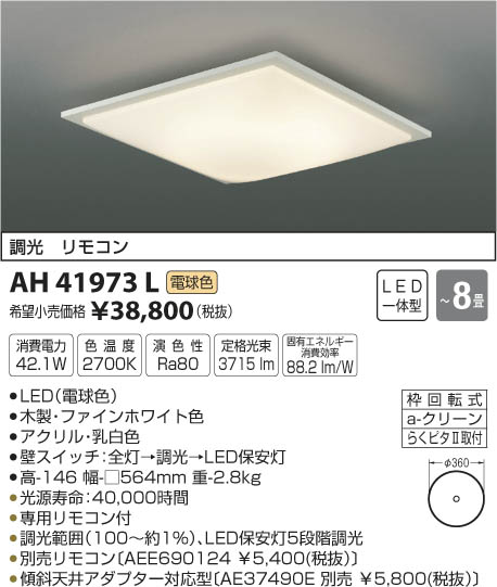 LED42.1W|¡üLED¡ÊÅŵ忧¡Ë|¡üÌÚÀ½¡¦¥Õ¥¡¥¤¥ó¥Û¥ï¥¤¥È¿§|¡ü¥¢¥¯¥ê¥ë¡¦ÆýÇò¿§|¡üÊÉ¥¹¥¤¥Ã¥Á¡§Á´Åô¢ªÄ´¸÷¢ªLEDÊݰÂÅô|¡É¡ü¹â-146 Éý-¢¢564mm ½Å-2.8kg¡É|¡ü¾ÃÈñÅÅÎÏ:42.1W|¡ü¿§²¹ÅÙ:2700K|¡ü±é¿§À:Ra80|¡É¡üÄê³Ê¸÷«:3¡¤715 lm¡É|¡É¡ü¸ÇÍ¥¨¥Í¥ë¥®¡¼¾ÃÈñ¸úΨ:88.2 lm/W¡É|¡É¡ü¸÷¸»¼÷Ì¿¡§40¡¤000»þ´Ö¡É|¡üÀìÍÑ¥ê¥â¥³¥óÉÕ|¡üÄ´¸÷ÈϰϡÊ100¡ÁÌó1¡ó¡Ë¡¢LEDÊݰÂÅô5Ãʳ¬Ä´¸÷|¡É¡üÊÌÇä¥ê¥â¥³¥ó¡ÌAEE690124 ¡ï5¡¤400¡ÊÀÇÈ´¡Ë¡Í¡É|¡É¡ü·¹¼ÐÅ·°æ¥¢¥À¥×¥¿Âбþ·¿¡ÌAE37490E ÊÌÇä ¡ï5¡¤800¡ÊÀÇÈ´¡Ë¡Í¡É ¡Á8¾ö