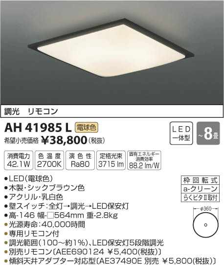 LED42.1W|¡üLED¡ÊÅŵ忧¡Ë|¡üÌÚÀ½¡¦¥·¥Ã¥¯¥Ö¥é¥¦¥ó¿§|¡ü¥¢¥¯¥ê¥ë¡¦ÆýÇò¿§|¡üÊÉ¥¹¥¤¥Ã¥Á¡§Á´Åô¢ªÄ´¸÷¢ªLEDÊݰÂÅô|¡É¡ü¹â-146 Éý-¢¢564mm ½Å-2.8kg¡É|¡ü¾ÃÈñÅÅÎÏ:42.1W|¡ü¿§²¹ÅÙ:2700K|¡ü±é¿§À:Ra80|¡É¡üÄê³Ê¸÷«:3¡¤715 lm¡É|¡É¡ü¸ÇÍ¥¨¥Í¥ë¥®¡¼¾ÃÈñ¸úΨ:88.2 lm/W¡É|¡É¡ü¸÷¸»¼÷Ì¿¡§40¡¤000»þ´Ö¡É|¡üÀìÍÑ¥ê¥â¥³¥óÉÕ|¡üÄ´¸÷ÈϰϡÊ100¡ÁÌó1¡ó¡Ë¡¢LEDÊݰÂÅô5Ãʳ¬Ä´¸÷|¡É¡üÊÌÇä¥ê¥â¥³¥ó¡ÌAEE690124 ¡ï5¡¤400¡ÊÀÇÈ´¡Ë¡Í¡É|¡É¡ü·¹¼ÐÅ·°æ¥¢¥À¥×¥¿Âбþ·¿¡ÌAE37490E ÊÌÇä ¡ï5¡¤800¡ÊÀÇÈ´¡Ë¡Í¡É ¡Á8¾ö