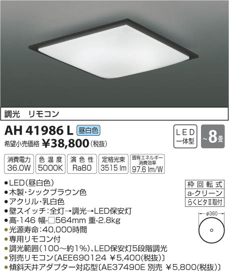 LED36.0W|¡üLED¡ÊÃëÇò¿§¡Ë|¡üÌÚÀ½¡¦¥·¥Ã¥¯¥Ö¥é¥¦¥ó¿§|¡ü¥¢¥¯¥ê¥ë¡¦ÆýÇò¿§|¡üÊÉ¥¹¥¤¥Ã¥Á¡§Á´Åô¢ªÄ´¸÷¢ªLEDÊݰÂÅô|¡É¡ü¹â-146 Éý-¢¢564mm ½Å-2.8kg¡É|¡ü¾ÃÈñÅÅÎÏ:36.0W|¡ü¿§²¹ÅÙ:5000K|¡ü±é¿§À:Ra80|¡É¡üÄê³Ê¸÷«:3¡¤515 lm¡É|¡É¡ü¸ÇÍ¥¨¥Í¥ë¥®¡¼¾ÃÈñ¸úΨ:97.6 lm/W¡É|¡É¡ü¸÷¸»¼÷Ì¿¡§40¡¤000»þ´Ö¡É|¡üÀìÍÑ¥ê¥â¥³¥óÉÕ|¡üÄ´¸÷ÈϰϡÊ100¡ÁÌó1¡ó¡Ë¡¢LEDÊݰÂÅô5Ãʳ¬Ä´¸÷|¡É¡üÊÌÇä¥ê¥â¥³¥ó¡ÌAEE690124 ¡ï5¡¤400¡ÊÀÇÈ´¡Ë¡Í¡É|¡É¡ü·¹¼ÐÅ·°æ¥¢¥À¥×¥¿Âбþ·¿¡ÌAE37490E ÊÌÇä ¡ï5¡¤800¡ÊÀÇÈ´¡Ë¡Í¡É ¡Á8¾ö