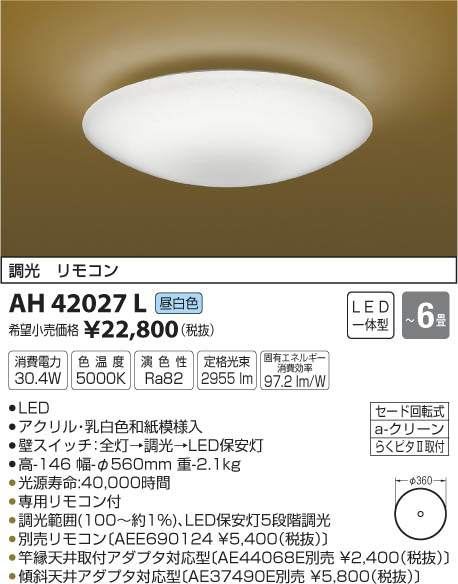 LED30.4W|¡üLED|¡ü¥¢¥¯¥ê¥ë¡¦ÆýÇò¿§Ï»æÌÏÍÍÆþ|¡üÊÉ¥¹¥¤¥Ã¥Á¡§Á´Åô¢ªÄ´¸÷¢ªLEDÊݰÂÅô|¡É¡ü¹â-146 Éý-¦Õ560mm ½Å-2.1kg¡É|¡ü¾ÃÈñÅÅÎÏ:30.4W|¡ü¿§²¹ÅÙ:5000K|¡ü±é¿§À:Ra82|¡É¡üÄê³Ê¸÷«:2¡¤955 lm¡É|¡É¡ü¸ÇÍ¥¨¥Í¥ë¥®¡¼¾ÃÈñ¸úΨ:97.2 lm/W¡É|¡É¡ü¸÷¸»¼÷Ì¿¡§40¡¤000»þ´Ö¡É|¡üÀìÍÑ¥ê¥â¥³¥óÉÕ|¡üÄ´¸÷ÈϰϡÊ100¡ÁÌó1¡ó¡Ë¡¢LEDÊݰÂÅô5Ãʳ¬Ä´¸÷|¡É¡üÊÌÇä¥ê¥â¥³¥ó¡ÌAEE690124 ¡ï5¡¤400¡ÊÀÇÈ´¡Ë¡Í¡É|¡É¡ü´È±ïÅ·°æ¼èÉÕ¥¢¥À¥×¥¿Âбþ·¿¡ÌAE44068EÊÌÇä ¡ï2¡¤400¡ÊÀÇÈ´¡Ë¡Í¡É|¡É¡ü·¹¼ÐÅ·°æ¥¢¥À¥×¥¿Âбþ·¿¡ÌAE37490EÊÌÇä ¡ï5¡¤800¡ÊÀÇÈ´¡Ë¡Í¡É ¡Á6¾ö