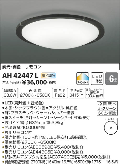 LED33.0W|¡üLED¡ÊÅŵ忧¡ÜÃë¸÷¿§¡Ë|¡üÌÚÀ½¡¦¥·¥Ã¥¯¥Ö¥é¥¦¥ó¿§|¡ü¥¢¥¯¥ê¥ë¡¦ÆýÇò¿§|¡ü¾þ¡§¥×¥é¥¹¥Á¥Ã¥¯¡¦¥¦¥©¡¼¥à¥·¥ë¥Ð¡¼ÅÉÁõ|¡üÊÉ¥¹¥¤¥Ã¥Á¡§Á´Åô¢ª¥·¡¼¥ó1¢ª¥·¡¼¥ó2¢ªLEDÊݰÂÅô|¡É¡ü¹â-147 Éý-¦Õ632mm ½Å-2.8kg¡É|¡ü¾ÃÈñÅÅÎÏ:33.0W|¡ü¿§²¹ÅÙ:2700K¡Á6500K|¡ü±é¿§À:Ra82|¡É¡üÄê³Ê¸÷«:3¡¤415 lm¡É|¡É¡ü¸ÇÍ¥¨¥Í¥ë¥®¡¼¾ÃÈñ¸úΨ:103.4 lm/W¡É|¡É¡ü¸÷¸»¼÷Ì¿¡§40¡¤000»þ´Ö¡É|¡üÀìÍÑ¥ê¥â¥³¥óÉÕ|¡üÄ´¸÷ÈϰϡÊ100¡ÁÌó1¡ó¡Ë¡¢LEDÊݰÂÅô5Ãʳ¬Ä´¸÷|¡üÄ´¿§ÈϰϡÊ2700K¡Á6500K¡Ë|¡É¡üÊÌÇä¥ê¥â¥³¥ó¡ÌAE38593E ¡ï5¡¤400¡ÊÀÇÈ´¡Ë¡Í¡É|¡É¡üÊÌÇä¥ê¥â¥³¥ó¡ÌAE44865E ¡ï3¡¤000¡ÊÀÇÈ´¡Ë¡Í¡É|¡É¡ü·¹¼ÐÅ·°æ¥¢¥À¥×¥¿Âбþ·¿¡ÌAE37490EÊÌÇä ¡ï5¡¤800¡ÊÀÇÈ´¡Ë¡Í¡É|¡üÄ´¿§»þÄê³Ê¸÷«ÃÍ¡§2700K»þ¡Ê1640lm¡¦16.5W¡Ë/6500K»þ¡Ê1775lm¡¦16.5W¡Ë ¡Á6¾ö