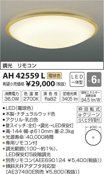 LED36.0W|¡üLED¡ÊÅŵ忧¡Ë|¡üÌÚÀ½¡¦¥Ê¥Á¥å¥é¥ë¥¦¥Ã¥É¿§|¡ü¥¢¥¯¥ê¥ë¡¦ÆýÇò¿§|¡üÊÉ¥¹¥¤¥Ã¥Á¡§Á´Åô¢ªÄ´¸÷¢ªLEDÊݰÂÅô|¡É¡ü¹â-144 Éý-¦Õ610mm ½Å-2.3kg¡É|¡ü¾ÃÈñÅÅÎÏ:36.0W|¡ü¿§²¹ÅÙ:2700K|¡ü±é¿§À:Ra82|¡É¡üÄê³Ê¸÷«:3¡¤405 lm¡É|¡É¡ü¸ÇÍ¥¨¥Í¥ë¥®¡¼¾ÃÈñ¸úΨ:94.5 lm/W¡É|¡É¡ü¸÷¸»¼÷Ì¿¡§40¡¤000»þ´Ö¡É|¡üÀìÍÑ¥ê¥â¥³¥óÉÕ|¡üÄ´¸÷ÈϰϡÊ100¡ÁÌó1%¡Ë¡¢LEDÊݰÂÅô5Ãʳ¬Ä´¸÷|¡É¡üÊÌÇä¥ê¥â¥³¥ó¡ÌAEE690124 ¡ï5¡¤400¡ÊÀÇÈ´¡Ë¡Í¡É|¡É¡ü·¹¼ÐÅ·°æ¥¢¥À¥×¥¿Âбþ·¿¡ÌAE37490E ÊÌÇä ¡ï5¡¤800¡ÊÀÇÈ´¡Ë¡Í¡É ¡Á6¾ö