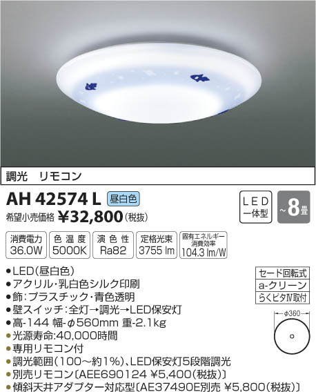 LED36.0W|¡üLED¡ÊÃëÇò¿§¡Ë|¡ü¥¢¥¯¥ê¥ë¡¦ÆýÇò¿§¥·¥ë¥¯°õºþ|¡ü¾þ¡§¥×¥é¥¹¥Á¥Ã¥¯¡¦ÀÄ¿§Æ©ÌÀ|¡üÊÉ¥¹¥¤¥Ã¥Á¡§Á´Åô¢ªÄ´¸÷¢ªLEDÊݰÂÅô|¡É¡ü¹â-144 Éý-¦Õ560mm ½Å-2.1kg¡É|¡ü¾ÃÈñÅÅÎÏ:36.0W|¡ü¿§²¹ÅÙ:5000K|¡ü±é¿§À:Ra82|¡É¡üÄê³Ê¸÷«:3¡¤755 lm¡É|¡É¡ü¸ÇÍ¥¨¥Í¥ë¥®¡¼¾ÃÈñ¸úΨ:104.3 lm/W¡É|¡É¡ü¸÷¸»¼÷Ì¿¡§40¡¤000»þ´Ö¡É|¡üÀìÍÑ¥ê¥â¥³¥óÉÕ|¡üÄ´¸÷ÈϰϡÊ100¡ÁÌó1¡ó¡Ë¡¢LEDÊݰÂÅô5Ãʳ¬Ä´¸÷|¡É¡üÊÌÇä¥ê¥â¥³¥ó¡ÌAEE690124 ¡ï5¡¤400¡ÊÀÇÈ´¡Ë¡Í¡É|¡É¡ü·¹¼ÐÅ·°æ¥¢¥À¥×¥¿Âбþ·¿¡ÌAE37490E ÊÌÇä ¡ï5¡¤800¡ÊÀÇÈ´¡Ë¡Í ¡É ¡Á8¾ö