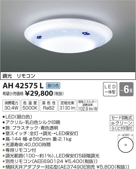 LED30.4W|¡üLED¡ÊÃëÇò¿§¡Ë|¡ü¥¢¥¯¥ê¥ë¡¦ÆýÇò¿§¥·¥ë¥¯°õºþ|¡ü¾þ¡§¥×¥é¥¹¥Á¥Ã¥¯¡¦ÀÄ¿§Æ©ÌÀ|¡üÊÉ¥¹¥¤¥Ã¥Á¡§Á´Åô¢ªÄ´¸÷¢ªLEDÊݰÂÅô|¡É¡ü¹â-144 Éý-¦Õ560mm ½Å-2.1kg¡É|¡ü¾ÃÈñÅÅÎÏ:30.4W|¡ü¿§²¹ÅÙ:5000K|¡ü±é¿§À:Ra82|¡É¡üÄê³Ê¸÷«:3¡¤130 lm¡É|¡É¡ü¸ÇÍ¥¨¥Í¥ë¥®¡¼¾ÃÈñ¸úΨ:102.9 lm/W¡É|¡É¡ü¸÷¸»¼÷Ì¿¡§40¡¤000»þ´Ö¡É|¡üÀìÍÑ¥ê¥â¥³¥óÉÕ|¡üÄ´¸÷ÈϰϡÊ100¡ÁÌó1¡ó¡Ë¡¢LEDÊݰÂÅô5Ãʳ¬Ä´¸÷|¡É¡üÊÌÇä¥ê¥â¥³¥ó¡ÌAEE690124 ¡ï5¡¤400¡ÊÀÇÈ´¡Ë¡Í¡É|¡É¡ü·¹¼ÐÅ·°æ¥¢¥À¥×¥¿Âбþ·¿¡ÌAE37490E ÊÌÇä ¡ï5¡¤800¡ÊÀÇÈ´¡Ë¡Í ¡É ¡Á6¾ö