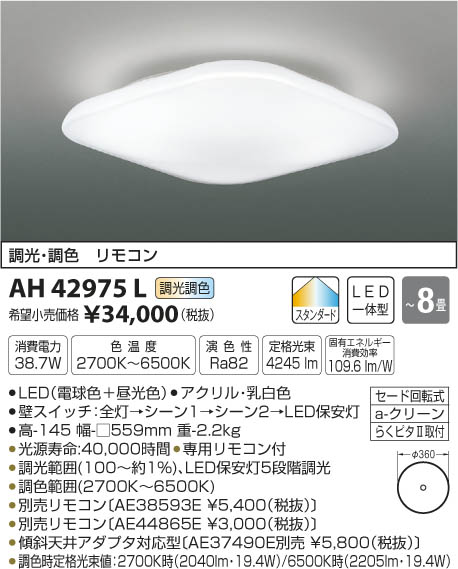 LED38.7W|¡üLED¡ÊÅŵ忧¡ÜÃë¸÷¿§¡Ë|¡ü¥¢¥¯¥ê¥ë¡¦ÆýÇò¿§|¡üÊÉ¥¹¥¤¥Ã¥Á¡§Á´Åô¢ª¥·¡¼¥ó1¢ª¥·¡¼¥ó2¢ªLEDÊݰÂÅô|¡É¡ü¹â-145 Éý-¢¢559mm ½Å-2.2kg¡É|¡ü¾ÃÈñÅÅÎÏ:38.7W|¡ü¿§²¹ÅÙ:2700K¡Á6500K|¡ü±é¿§À:Ra82|¡É¡üÄê³Ê¸÷«:4¡¤245 lm¡É|¡É¡ü¸ÇÍ¥¨¥Í¥ë¥®¡¼¾ÃÈñ¸úΨ:109.6 lm/W¡É|¡É¡ü¸÷¸»¼÷Ì¿¡§40¡¤000»þ´Ö¡É|¡üÀìÍÑ¥ê¥â¥³¥óÉÕ|¡üÄ´¸÷ÈϰϡÊ100¡ÁÌó1¡ó¡Ë¡¢LEDÊݰÂÅô5Ãʳ¬Ä´¸÷|¡üÄ´¿§ÈϰϡÊ2700K¡Á6500K¡Ë|¡É¡üÊÌÇä¥ê¥â¥³¥ó¡ÌAE38593E ¡ï5¡¤400¡ÊÀÇÈ´¡Ë¡Í¡É|¡É¡üÊÌÇä¥ê¥â¥³¥ó¡ÌAE44865E ¡ï3¡¤000¡ÊÀÇÈ´¡Ë¡Í¡É|¡É¡ü·¹¼ÐÅ·°æ¥¢¥À¥×¥¿Âбþ·¿¡ÌAE37490EÊÌÇä ¡ï5¡¤800¡ÊÀÇÈ´¡Ë¡Í¡É|¡üÄ´¿§»þÄê³Ê¸÷«ÃÍ¡§2700K»þ¡Ê2040lm¡¦19.4W¡Ë/6500K»þ¡Ê2205lm¡¦19.4W¡Ë ¡Á8¾ö